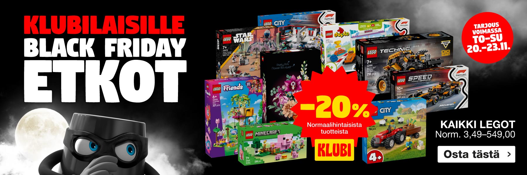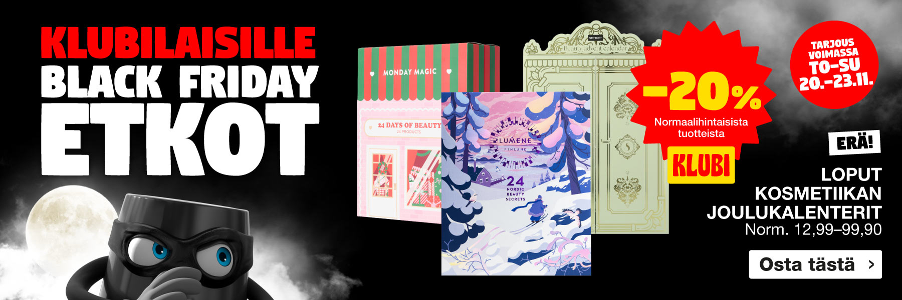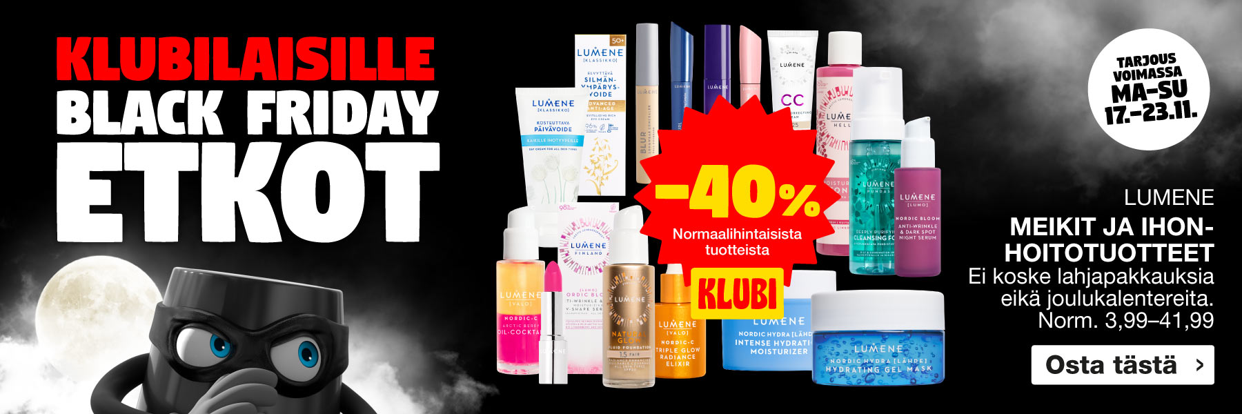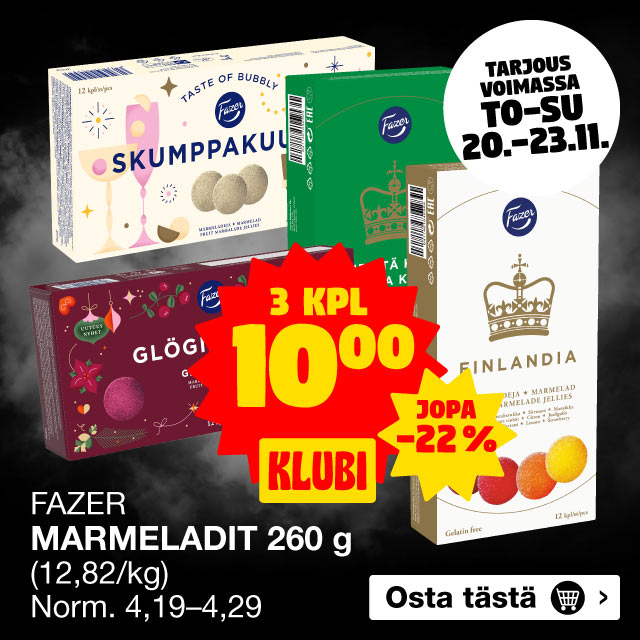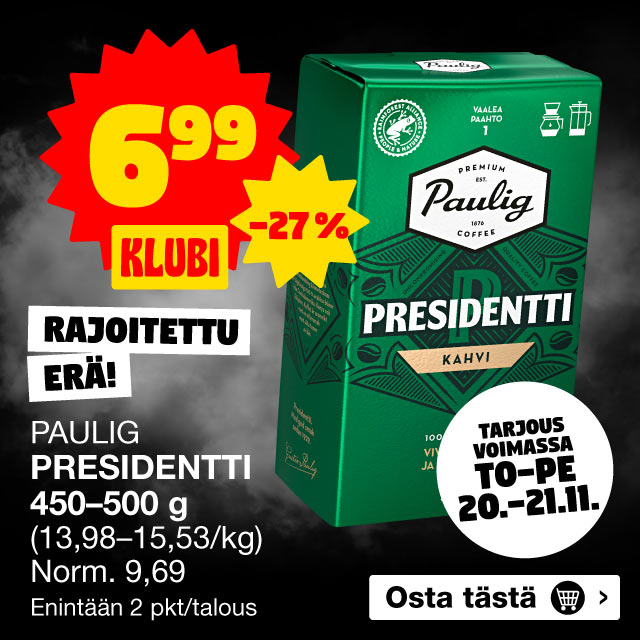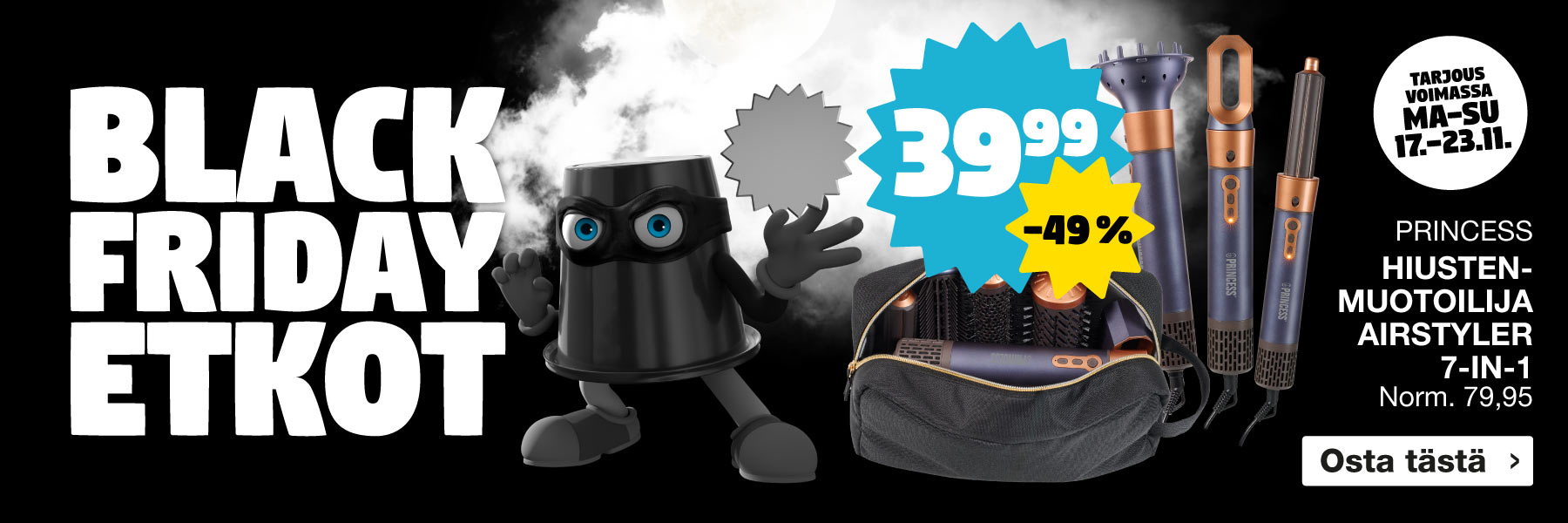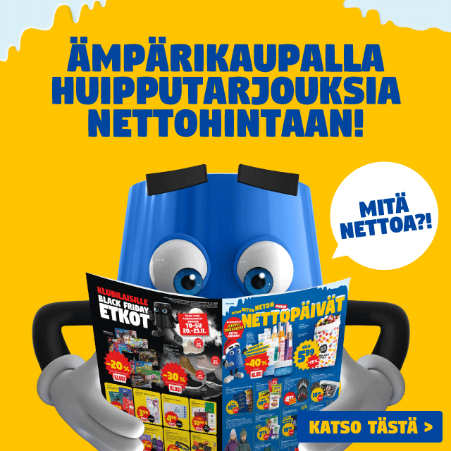 Tarjoukset ovat voimassa maanantaista sunnuntaihin 17.–23.11.2025, ellei tuotteen yhteydessä toisin mainita tai niin kauan kuin tuotteita riittää tarjousaikana. Kampanjatuotteista ei voi tehdä myymälävarauksia. Osassa myymälöistä rajoitettu valikoima. Ei jälleenmyyjille. Myymälän hinta saattaa poiketa verkkokaupan hinnasta. Voit tarkistaa tuotteiden myymäläkohtaisen saatavuuden ja tuotekohtaisen toimitusajan tuotekorteilta.