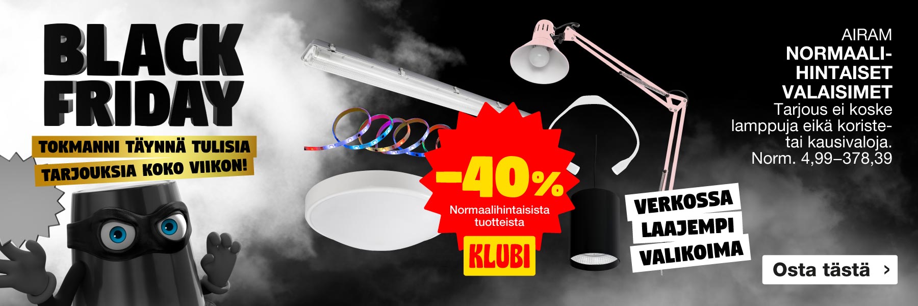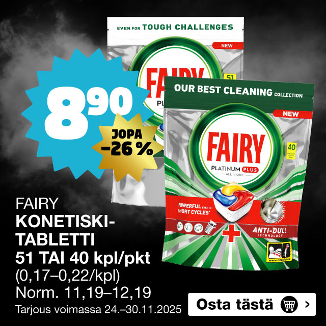 Tarjoukset ovat voimassa maanantaista sunnuntaihin 24.â30.11.2025, ellei tuotteen yhteydessĂ€ toisin mainita tai niin kauan kuin tuotteita riittÀÀ tarjousaikana. Kampanjatuotteista ei voi tehdĂ€ myymĂ€lĂ€varauksia. Osassa myymĂ€löistĂ€ rajoitettu valikoima. Ei jĂ€lleenmyyjille. MyymĂ€lĂ€n hinta saattaa poiketa verkkokaupan hinnasta. Voit tarkistaa tuotteiden myymĂ€lĂ€kohtaisen saatavuuden ja tuotekohtaisen toimitusajan tuotekorteilta.