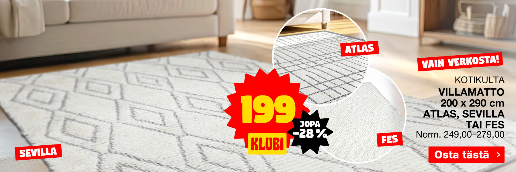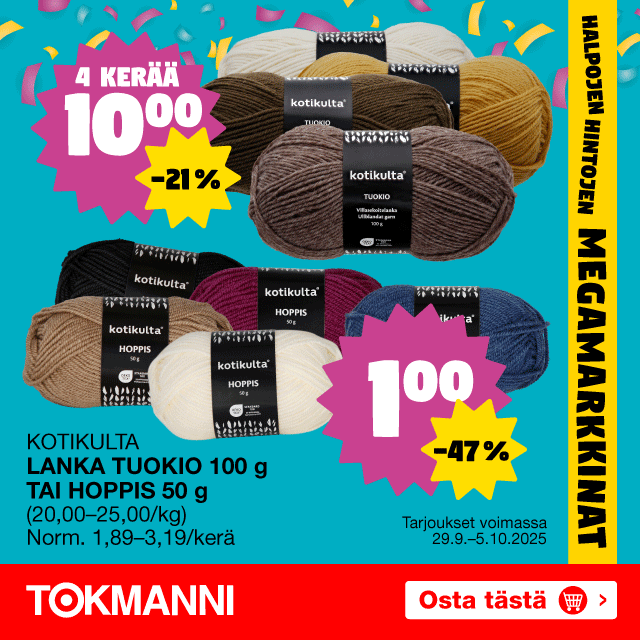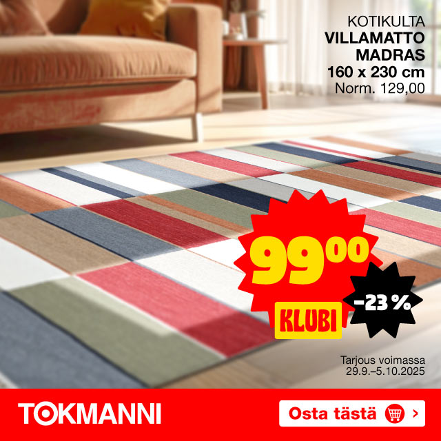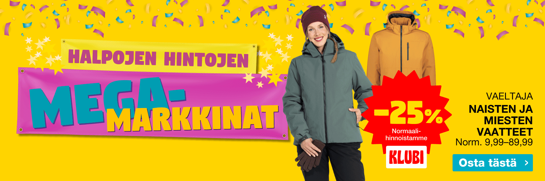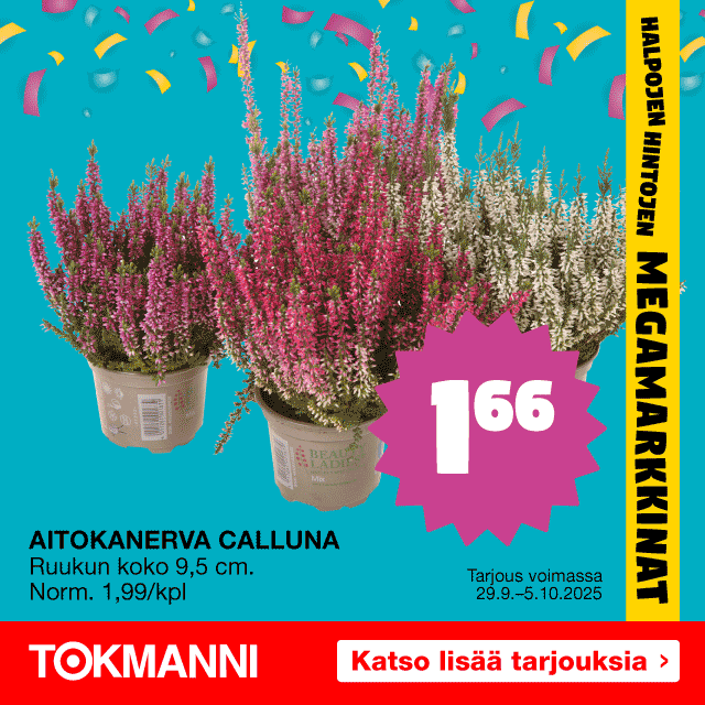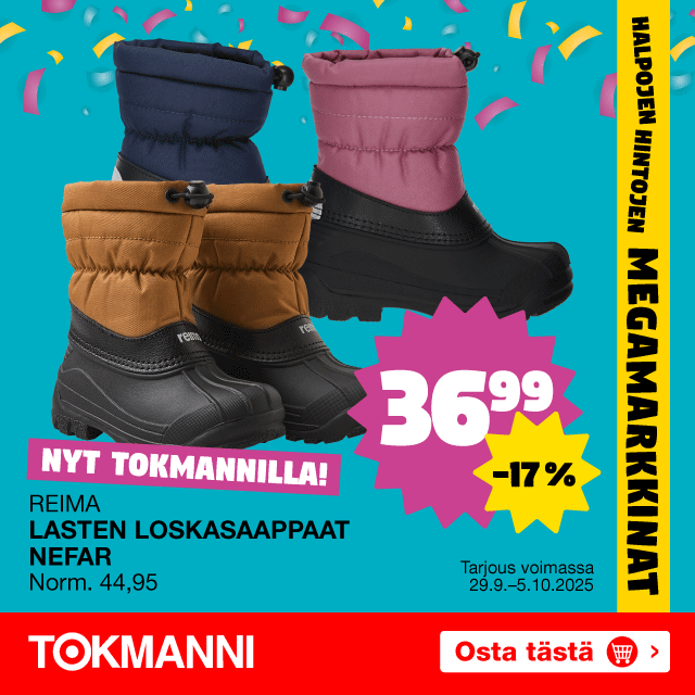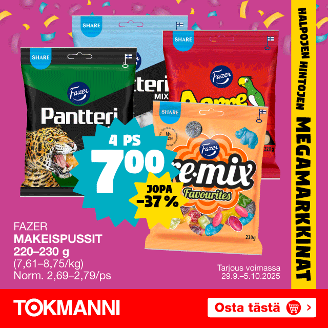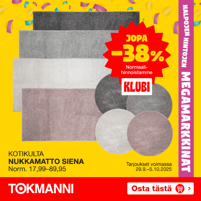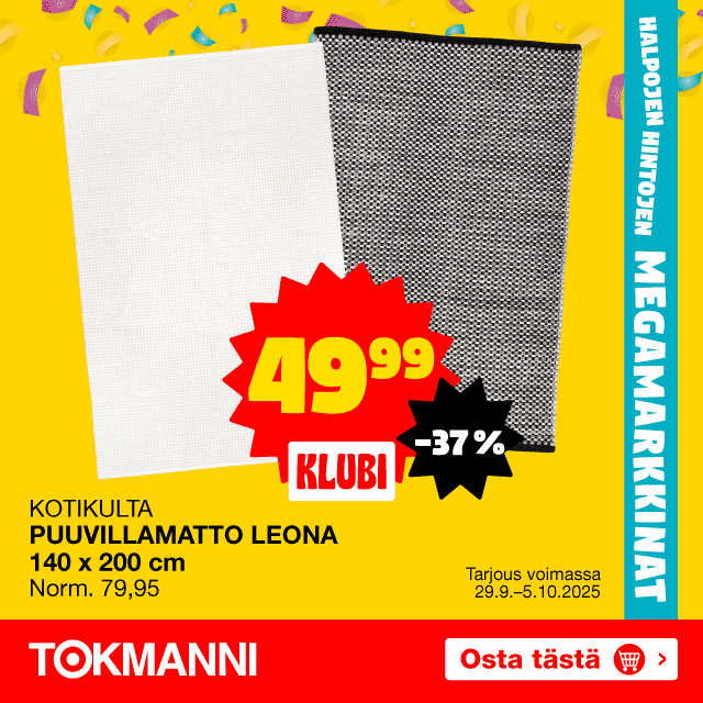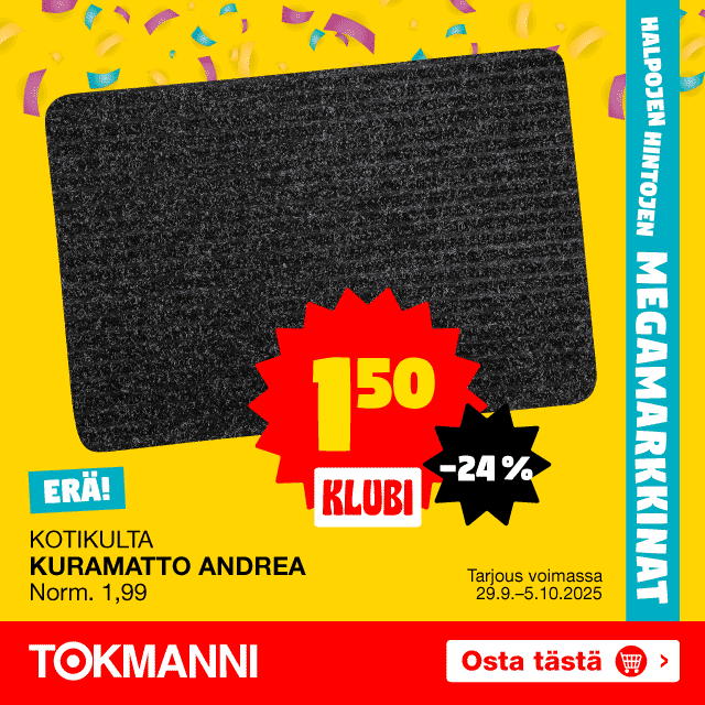 Tarjoukset ovat voimassa maanantaista sunnuntaihin 29.9.–5.10.2025, ellei tuotteen yhteydessä toisin mainita tai niin kauan kuin tuotteita riittää tarjousaikana. Kampanjatuotteista ei voi tehdä myymälävarauksia. Osassa myymälöistä rajoitettu valikoima. Ei jälleenmyyjille. Myymälän hinta saattaa poiketa verkkokaupan hinnasta. Voit tarkistaa tuotteiden myymäläkohtaisen saatavuuden ja tuotekohtaisen toimitusajan tuotekorteilta.