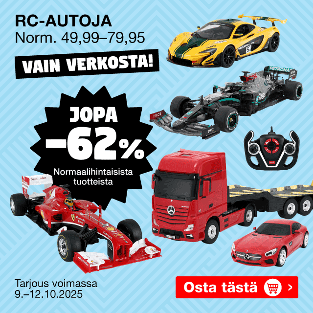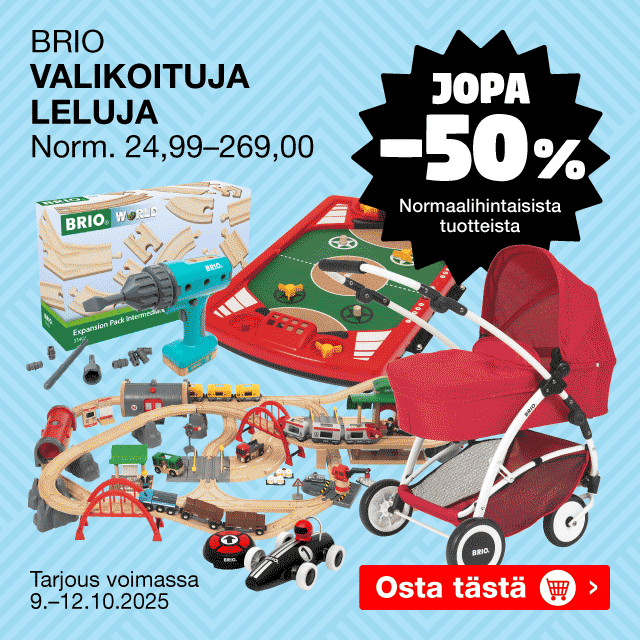 Hot Wheels pikkuauto 1€, ErĂ€ Brio-leluja jopa -50%, nuken tarvikkeita jopa -75%, RC-autoja jopa -66% ja Alga- ja Ravensburger-pelejĂ€ -40%
