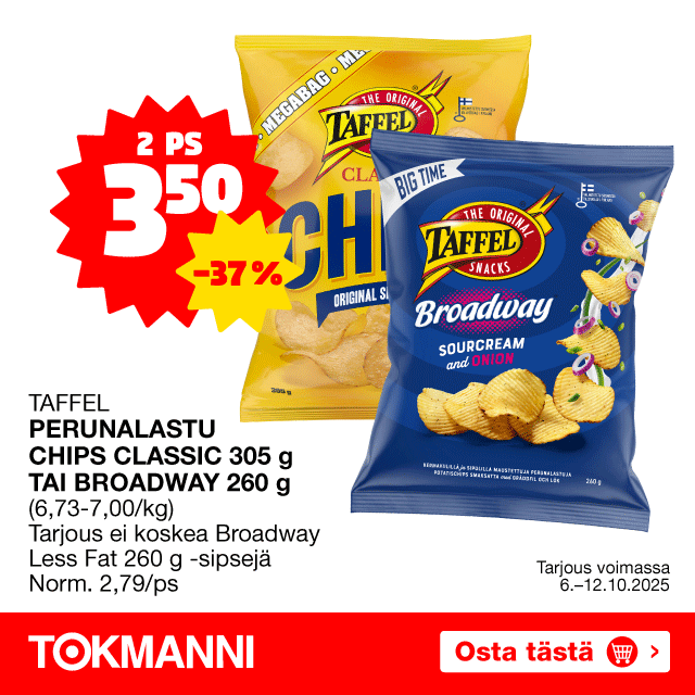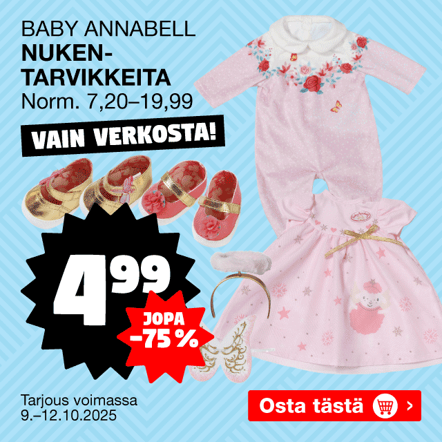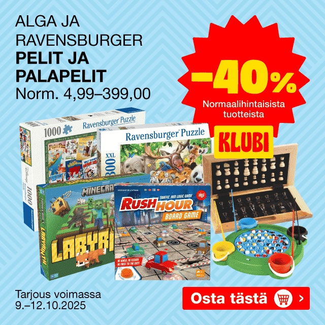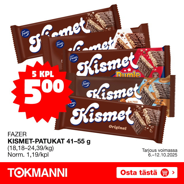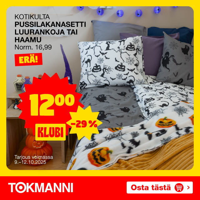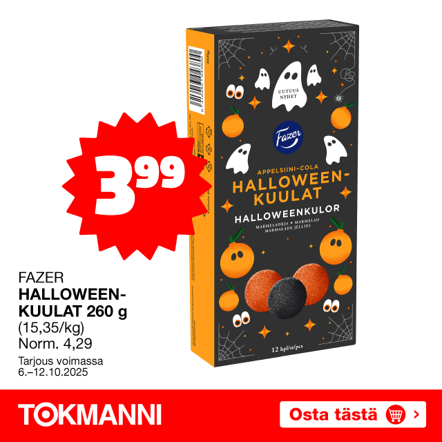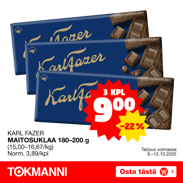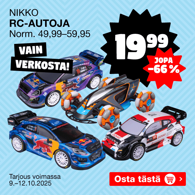 Tarjoukset ovat voimassa maanantaista sunnuntaihin 6.–12.10.2025, ellei tuotteen yhteydessĂ€ toisin mainita tai niin kauan kuin tuotteita riittÀÀ tarjousaikana. Kampanjatuotteista ei voi tehdĂ€ myymĂ€lĂ€varauksia. Osassa myymĂ€löistĂ€ rajoitettu valikoima. Ei jĂ€lleenmyyjille. MyymĂ€lĂ€n hinta saattaa poiketa verkkokaupan hinnasta. Voit tarkistaa tuotteiden myymĂ€lĂ€kohtaisen saatavuuden ja tuotekohtaisen toimitusajan tuotekorteilta.