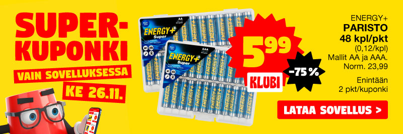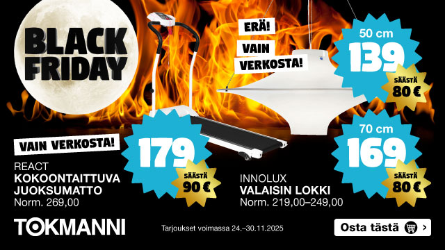 Tarjoukset ovat voimassa maanantaista sunnuntaihin 24.â30.11.2025, ellei tuotteen yhteydessĂ€ toisin mainita tai niin kauan kuin tuotteita riittÀÀ tarjousaikana. Kampanjatuotteista ei voi tehdĂ€ myymĂ€lĂ€varauksia. Osassa myymĂ€löistĂ€ rajoitettu valikoima. Ei jĂ€lleenmyyjille. MyymĂ€lĂ€n hinta saattaa poiketa verkkokaupan hinnasta. Voit tarkistaa tuotteiden myymĂ€lĂ€kohtaisen saatavuuden ja tuotekohtaisen toimitusajan tuotekorteilta.