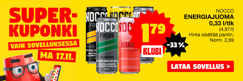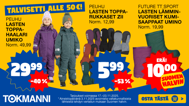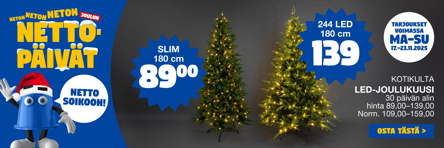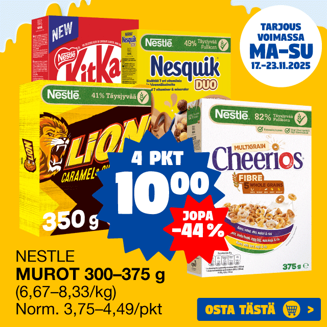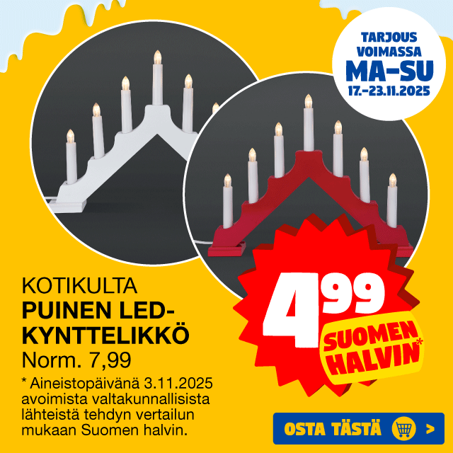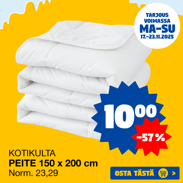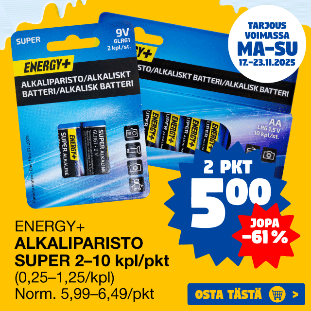 Tarjoukset ovat voimassa maanantaista sunnuntaihin 17.–23.11.2025, ellei tuotteen yhteydessä toisin mainita tai niin kauan kuin tuotteita riittää tarjousaikana. Kampanjatuotteista ei voi tehdä myymälävarauksia. Osassa myymälöistä rajoitettu valikoima. Ei jälleenmyyjille. Myymälän hinta saattaa poiketa verkkokaupan hinnasta. Voit tarkistaa tuotteiden myymäläkohtaisen saatavuuden ja tuotekohtaisen toimitusajan tuotekorteilta.