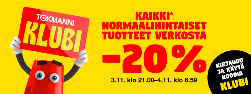 Tarjoamme KAIKKI* Tokmanni-verkkokauppamme normaalihintaiset tuotteet Klubilaisille tuntuvalla 20 %:n alennuksella đŸ™ŒđŸŒ. Alennus on voimassa ma 3.11. klo 21.00 — ti 4.11. klo 6.59. TĂ€tĂ€ tilaisuutta ei kannata ohittaa!