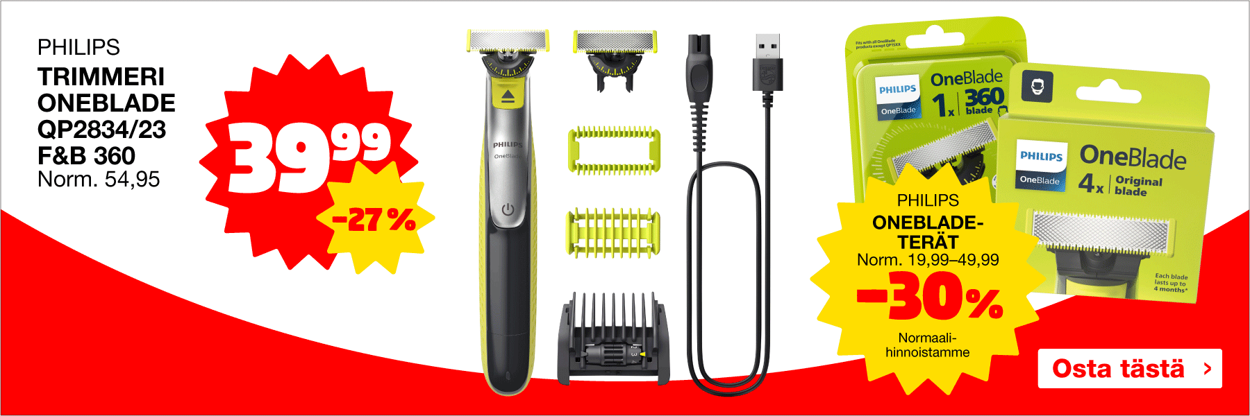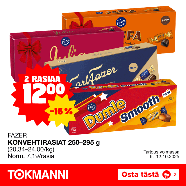 Tarjoukset ovat voimassa maanantaista sunnuntaihin 6.–12.10.2025, ellei tuotteen yhteydessä toisin mainita tai niin kauan kuin tuotteita riittää tarjousaikana. Kampanjatuotteista ei voi tehdä myymälävarauksia. Osassa myymälöistä rajoitettu valikoima. Ei jälleenmyyjille. Myymälän hinta saattaa poiketa verkkokaupan hinnasta. Voit tarkistaa tuotteiden myymäläkohtaisen saatavuuden ja tuotekohtaisen toimitusajan tuotekorteilta.