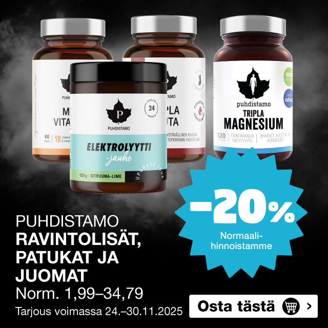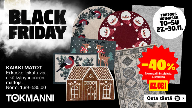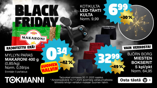 Tarjoukset ovat voimassa maanantaista sunnuntaihin 24.–30.11.2025, ellei tuotteen yhteydessĂ€ toisin mainita tai niin kauan kuin tuotteita riittÀÀ tarjousaikana. Kampanjatuotteista ei voi tehdĂ€ myymĂ€lĂ€varauksia. Osassa myymĂ€löistĂ€ rajoitettu valikoima. Ei jĂ€lleenmyyjille. MyymĂ€lĂ€n hinta saattaa poiketa verkkokaupan hinnasta. Voit tarkistaa tuotteiden myymĂ€lĂ€kohtaisen saatavuuden ja tuotekohtaisen toimitusajan tuotekorteilta.